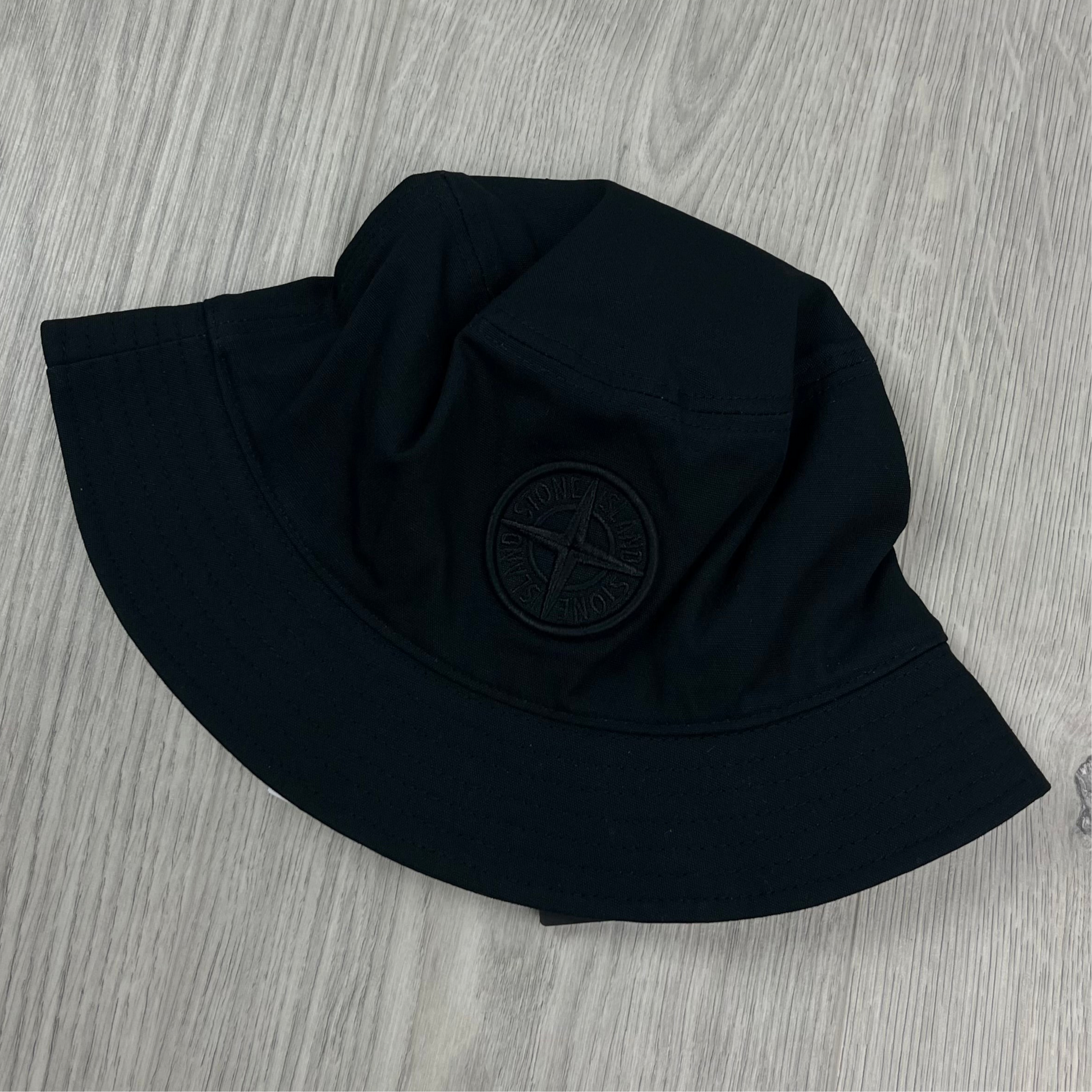 This Stone Island bucket hat is crafted from garment-dyed cotton canvas, offering a soft yet structured feel. It features a stitched brim, internal sweatband, and signature compass logo patch on the side. Finished in Black for a sleek and versatile seasonal accessory.