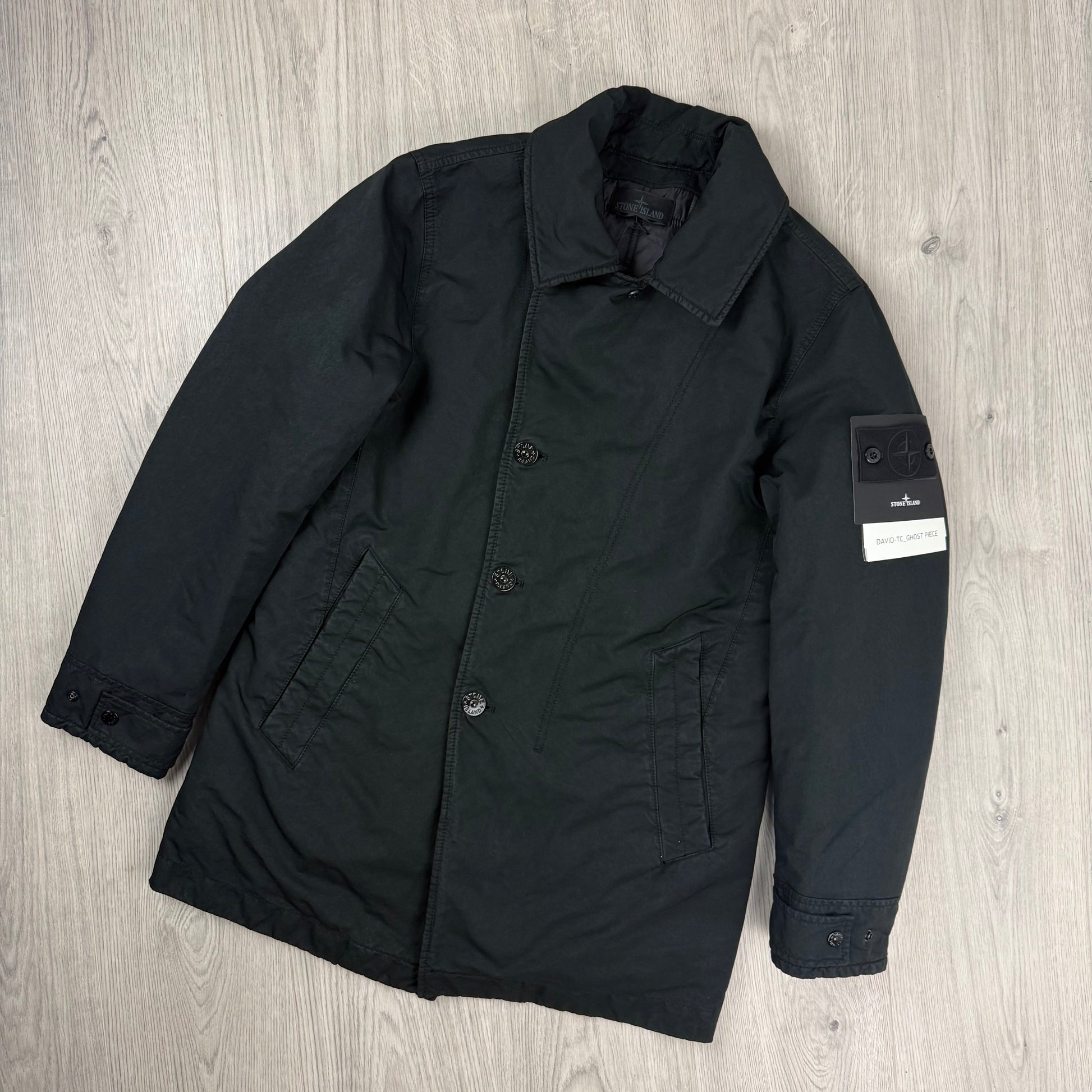 This Stone Island Ghost Padded Pea Coat in Black reimagines classic naval styling through a technical lens—crafted in David-TC fabric, garment-dyed under heat and pressure for a lived-in surface.