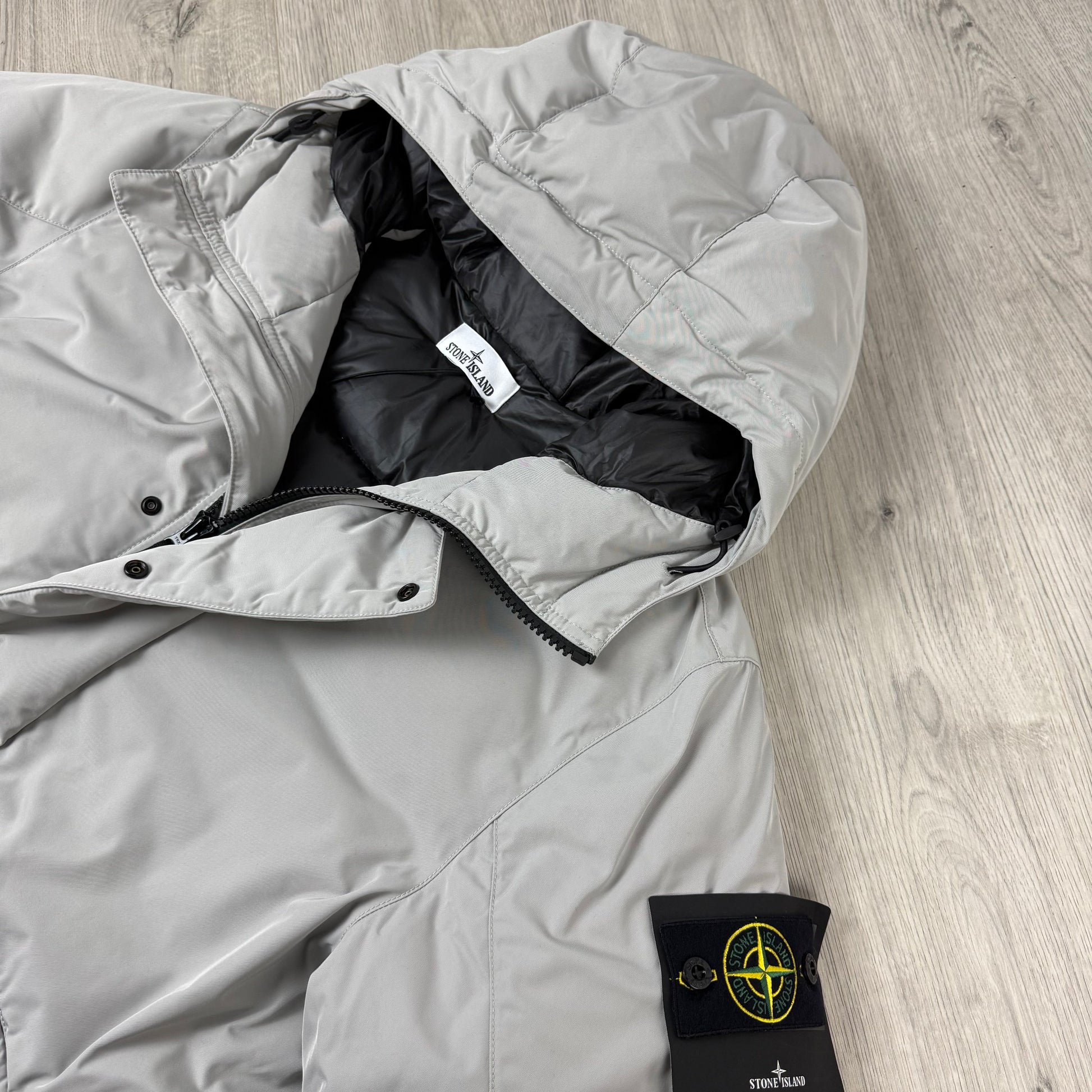 A technical Stone Island Micro Twill Down Parka in Pearl Grey that combines warmth, protection, and understated urban style.