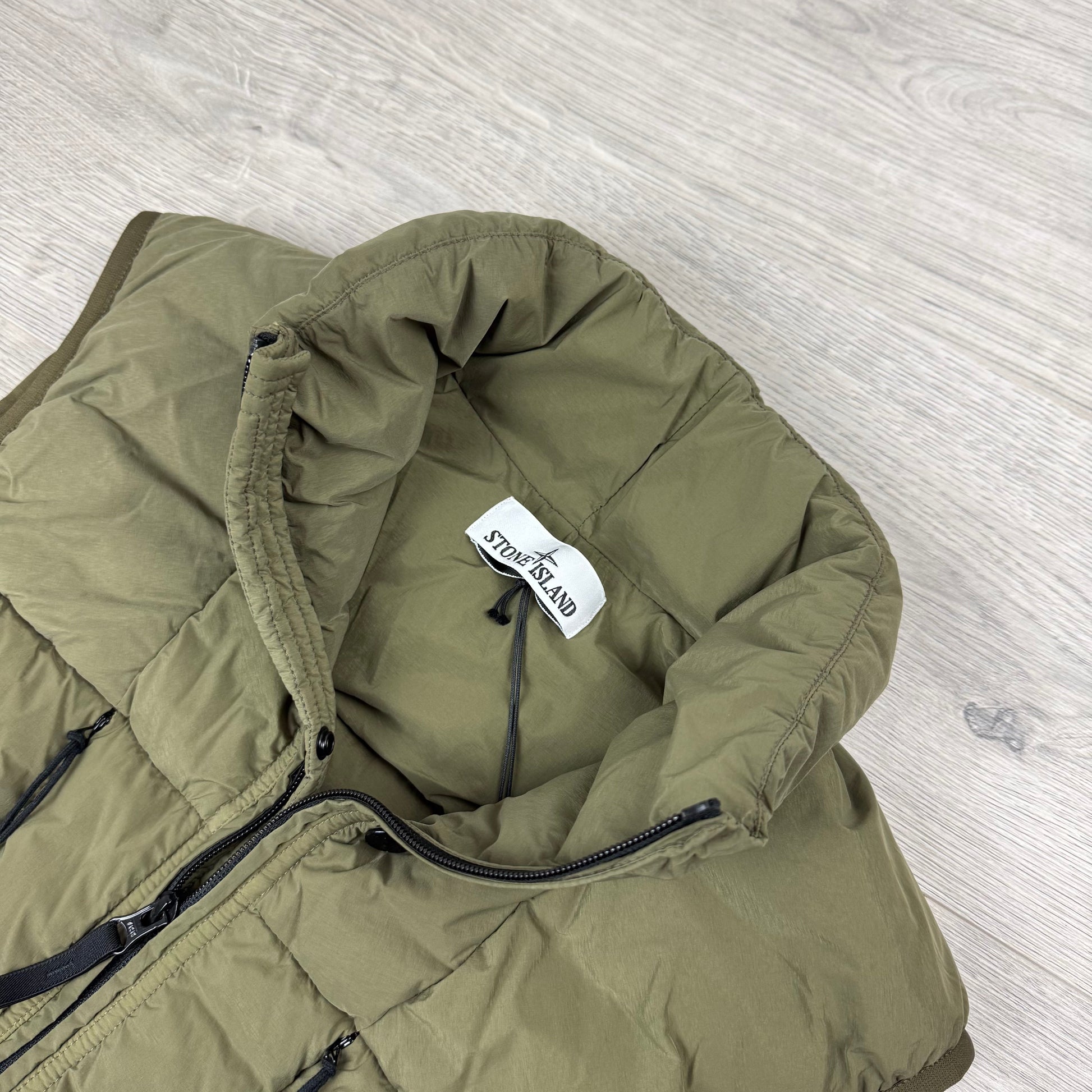 A standout technical outerwear piece from Stone Island, this Seamless Tunnel Nylon Down-TC Gilet in Military Green harnesses advanced engineering with premium design.