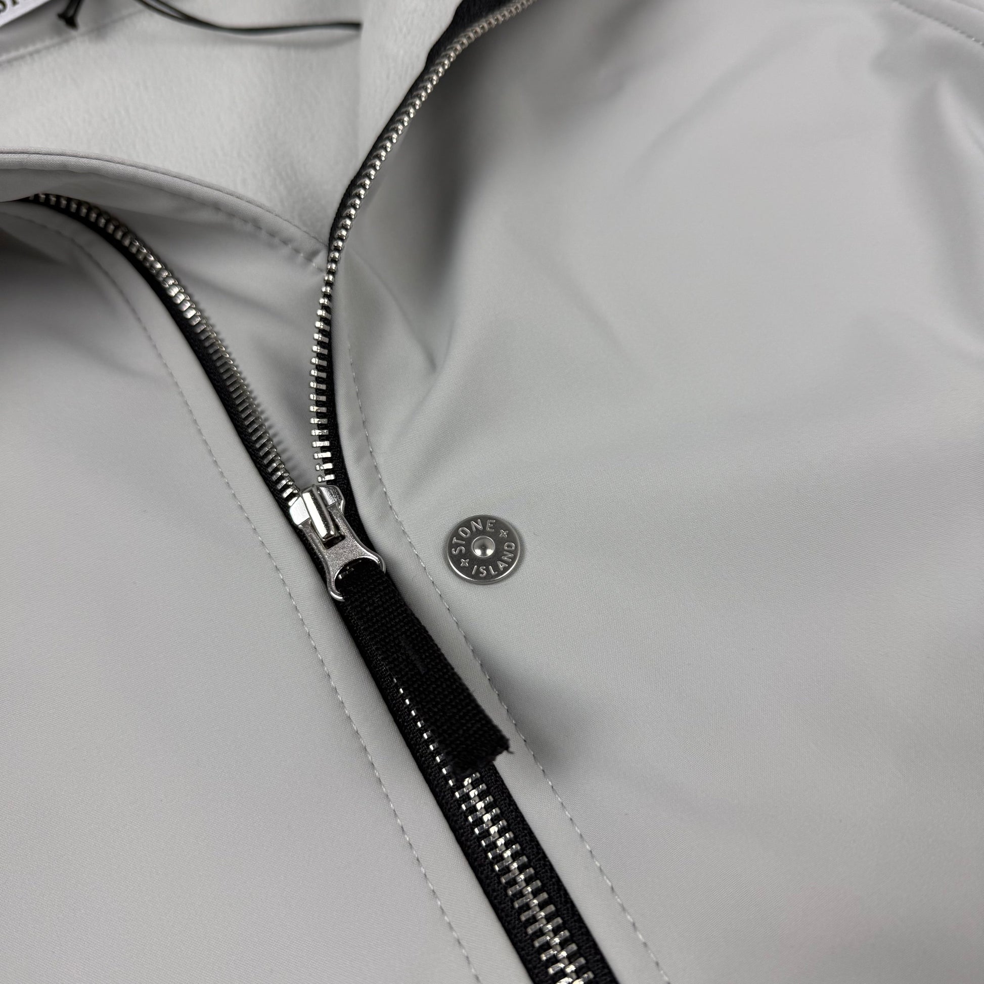 A high-performance outer layer by Stone Island, the Light Soft Shell-R Hooded Jacket in Pearl Grey utilises recycled-polyester fabric engineered through the e.Dye® waterless-colour system, delivering refined utility with sustainable innovation.